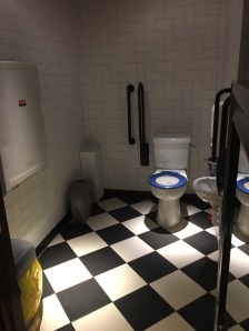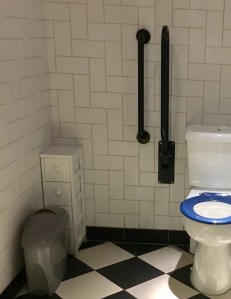 Something that caught my eye was a large mirror on the back of the door, which was the right height for myself to use, and given its size probably usable to somebody standing too. This is quite the rarity in accessible toilets. Often when they do actually consider that disabled people might need to check their appearance or reapply some make up, they put the mirror too high, too low, or just in a really random place like beside the toilet! This mirror was situated well and easy to use.