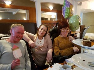 I’ll start by explaining that the day before the baby shower I had a few staffing issues, my PA due to work that weekend had gone off sick. Chatting to a friend I mentioned that I was worried that I wouldn’t be able to join them all at the baby shower as I was having trouble finding a PA to cover (I’d tried everyone). Straight away she just offered to come and pick me up. Now picking me up isn’t as easy as picking up most of your friends, picking me up meant driving to my house, loading and clamping me and my chair into my wheelchair accessible vehicle, and driving my fairly large Renault Traffic, with me and my very wobbly head in the back! Janette isn’t known for her calmness, however she did a smashing job! Asking every three minutes if I was ‘still alive in the back there?’ I was so tempted to not answer!