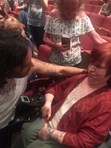I didn’t escape entirely, and am I glad I didn’t! After calling for an interval Russell just ‘hung around’ climbing off the stage and chatting to individuals in the audience. (I know Russell, is there such a thing as an individual or are we all just interconnected as one being….). Me, being stuck on row k and unable to meander around the stalls noticed Russell headed my way, climbing over rows of seats! Upon reaching me Russell asked if I’d noticed him trying to make his way over to say hi. After the usual pleasantries of hi’s and how are you’s Russell pointed to my phone suggesting he take a snap of us. Of course he can! Fourteen selfies and some dodgy facial expressions (on both parts) later Russell preceded to ask how I was doing in life.