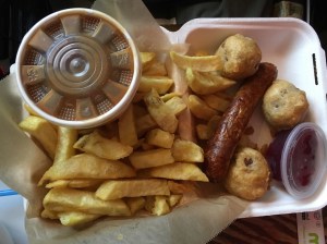 The Grosvenor Fish Bar’s take on a Christmas Dinner. Turkey sausage, chips, deep fried battered stuffing balls, gravy and cranberry sauce. Yes what a combination. A fantastic combination! I must say it was delicious, but then I didn’t expect anything less from the best chippy in Norwich, Norfolk even, dare I say the world? I can’t, I haven’t visited them all. But it is great. I don’t know whether using the word ‘chippy’ is degrading, but then ‘Fish Bar’ isn’t right either. It’s friendly and tasty like a local chippy, but then sophisticated in the food that it serves. Variety and quality. The ‘B.B.L.T’ or ‘Toad in The Hole’ for example.